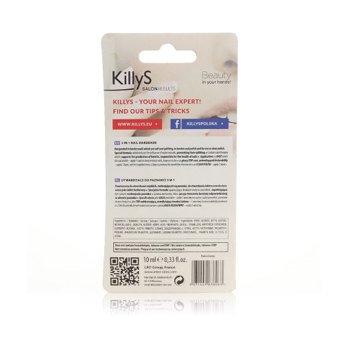 Killys 3-in-1 Hardener Hypoallergenic is an advanced nail treatment designed to strengthen, protect, and smooth fragile nails. With its gentle hypoallergenic formula, it reinforces nail structure, prevents breakage, and enhances resilience without causing irritation. Acting as a treatment, protective layer, and base coat in one, it delivers healthier, shinier, and more durable nails while being safe for sensitive users.