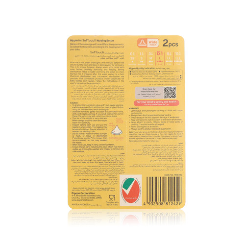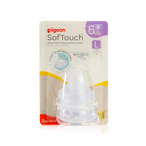 The Pigeon SoftTouch™ Wide Neck Nipples (Size L) are ideal for babies aged 6 months and up who are ready for a faster milk flow. The Peristaltic PLUS design encourages natural tongue movement, promoting healthy oral development. Made from ultra-soft silicone, these nipples offer a natural feel and latch similar to breastfeeding. The built-in Air Ventilation System (AVS™) helps prevent colic by minimizing swallowed air. Compatible with all Pigeon Wide Neck bottles, they make feeding safe, smooth, and developmentally appropriate.